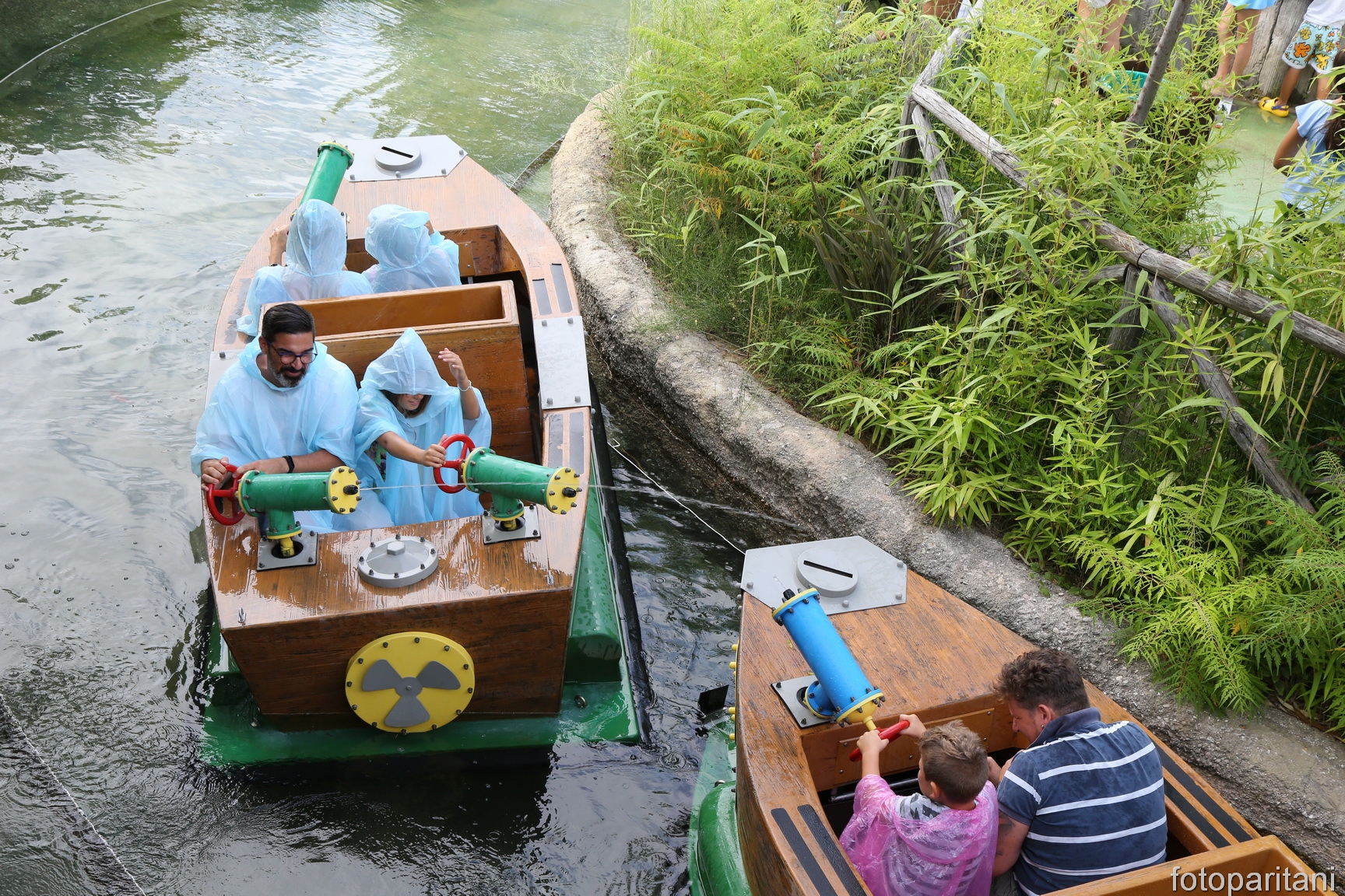 A fantasy world with suspension bridges, high-altitude paths, ladders, poles, ropes, and a river to travel by boat, with water cannons for dripping battles.
