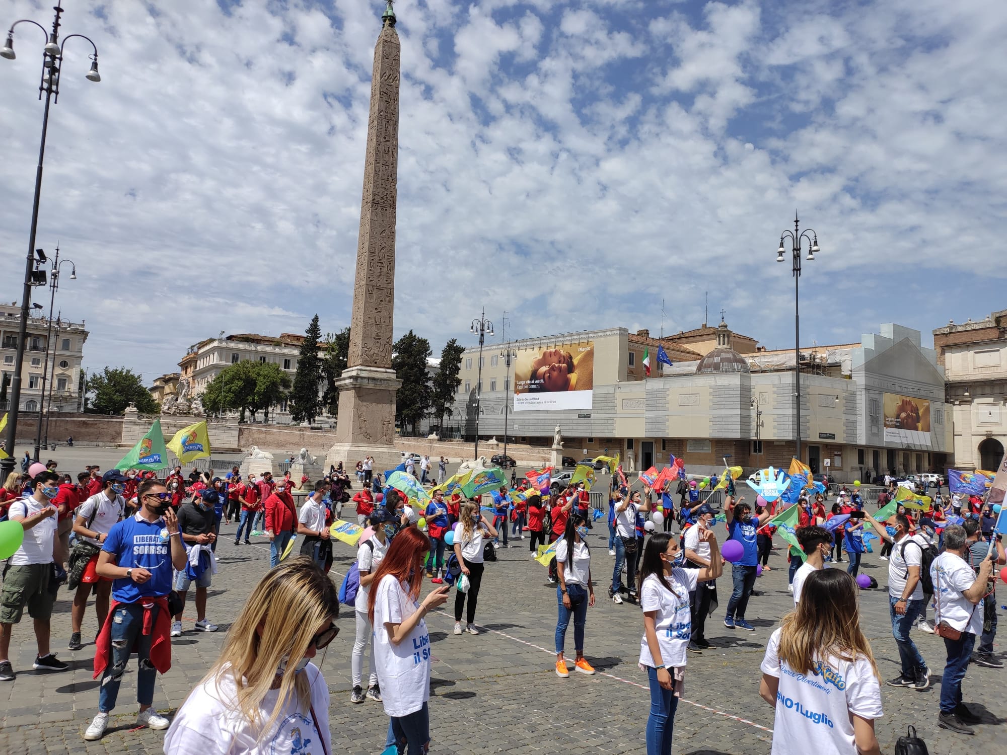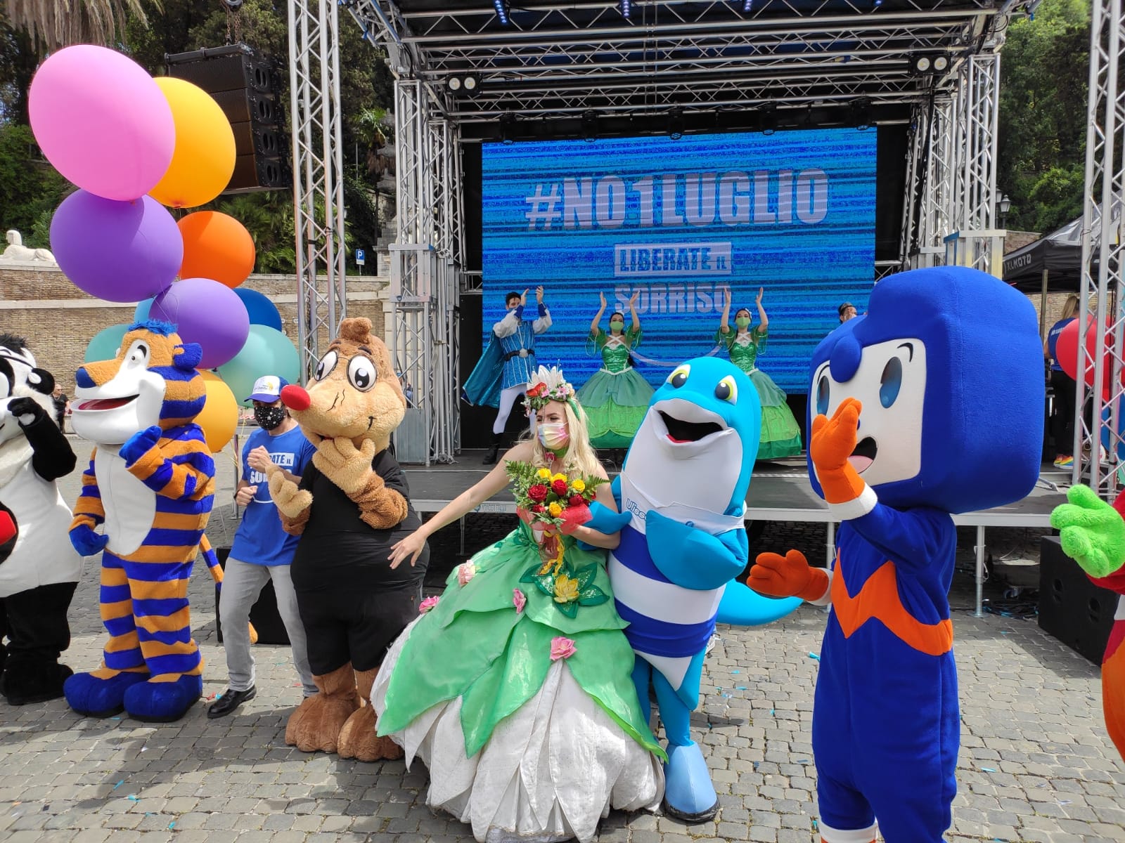 No al 1° luglio: liberate il sorriso! questo lo slogan della manifestazione in corso in Piazza del Popolo, a Roma, alla quale il Gruppo Costa Edutainment partecipa con una rappresentanza dei suoi parchi tematici, chiusi ormai dallo scorso ottobre