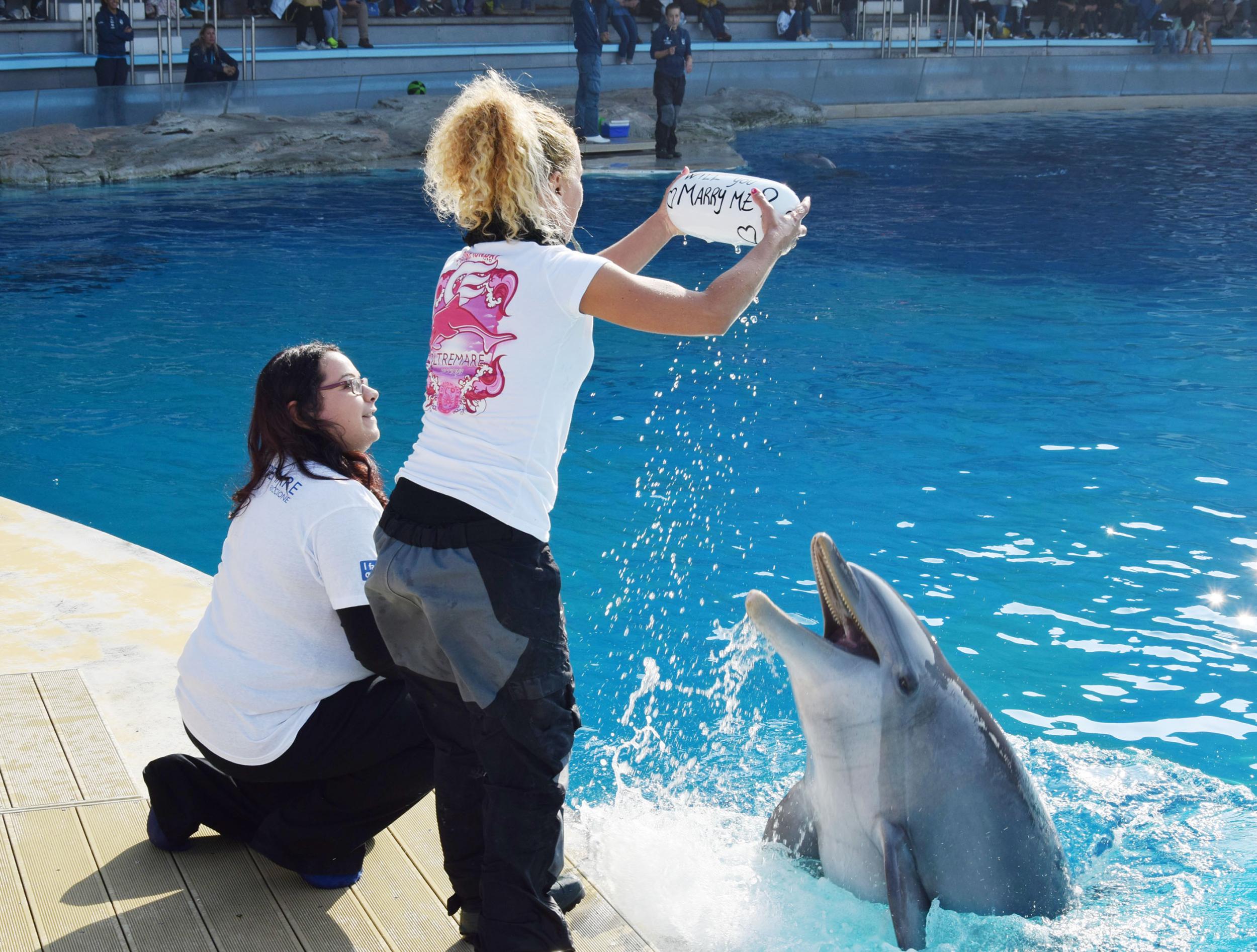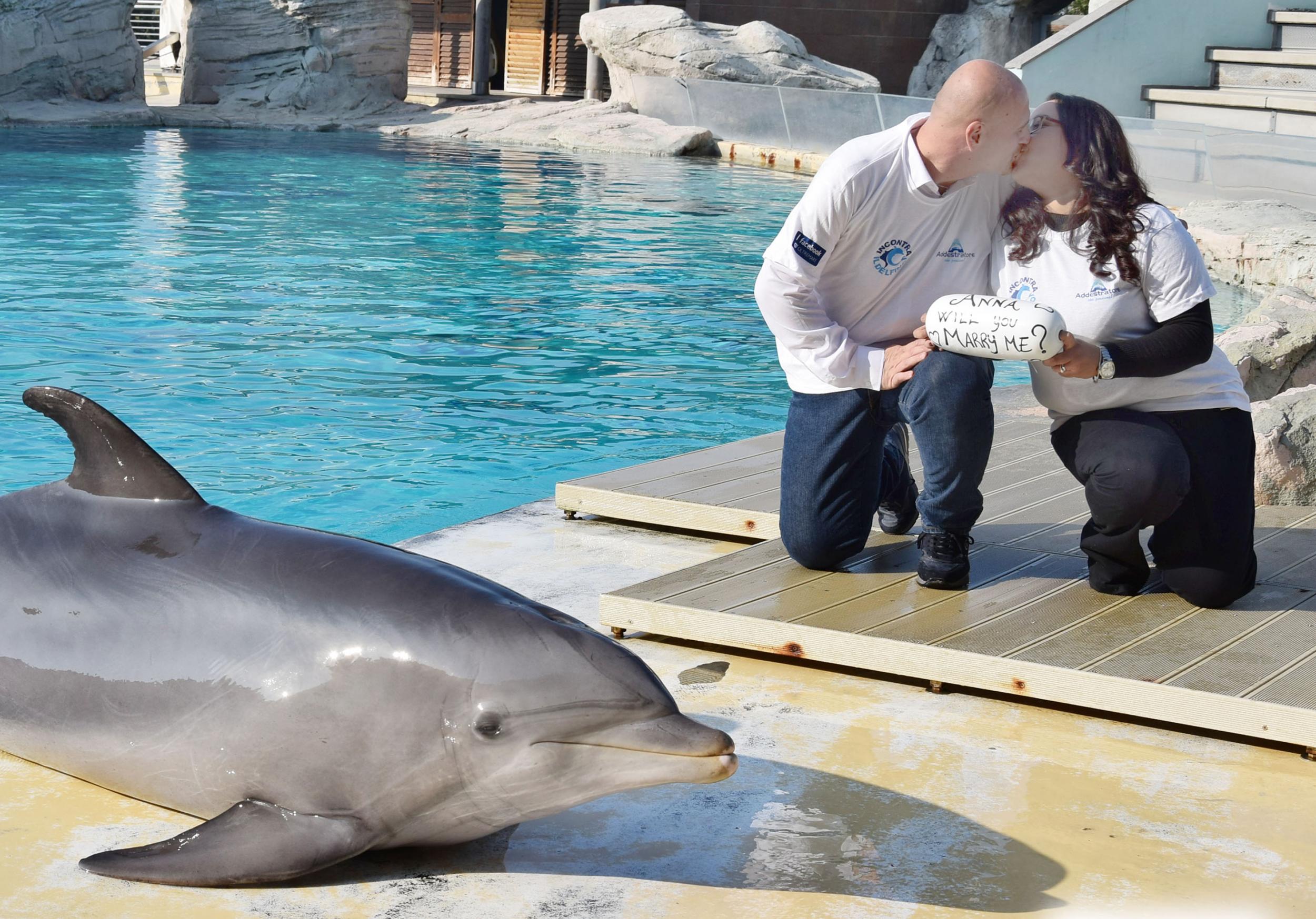 Una dichiarazione d’amore davanti a oltre 1000 persone, nella Laguna dei delfini del parco di Riccione. Lui, in ginocchio a bordo vasca le ha fatto la fatidica domanda, anello in mano. Lei, fra le lacrime, sotto gli sguardi curiosi dei delfini e la colonna sonora di Bruno Mars “Marry You”, ha risposto di sì.