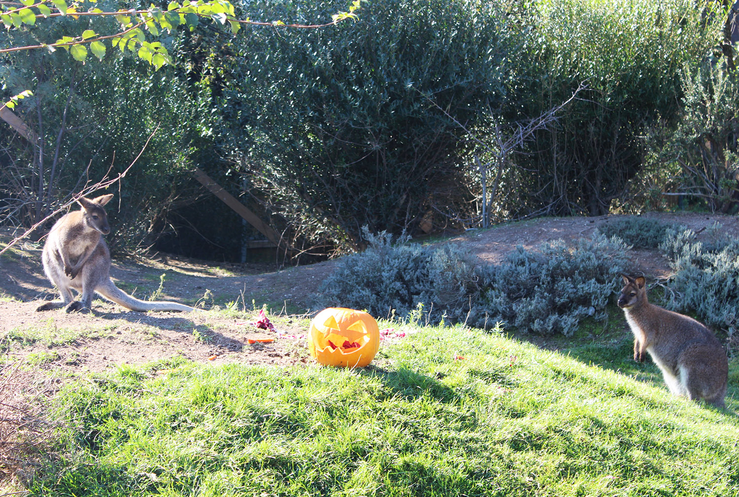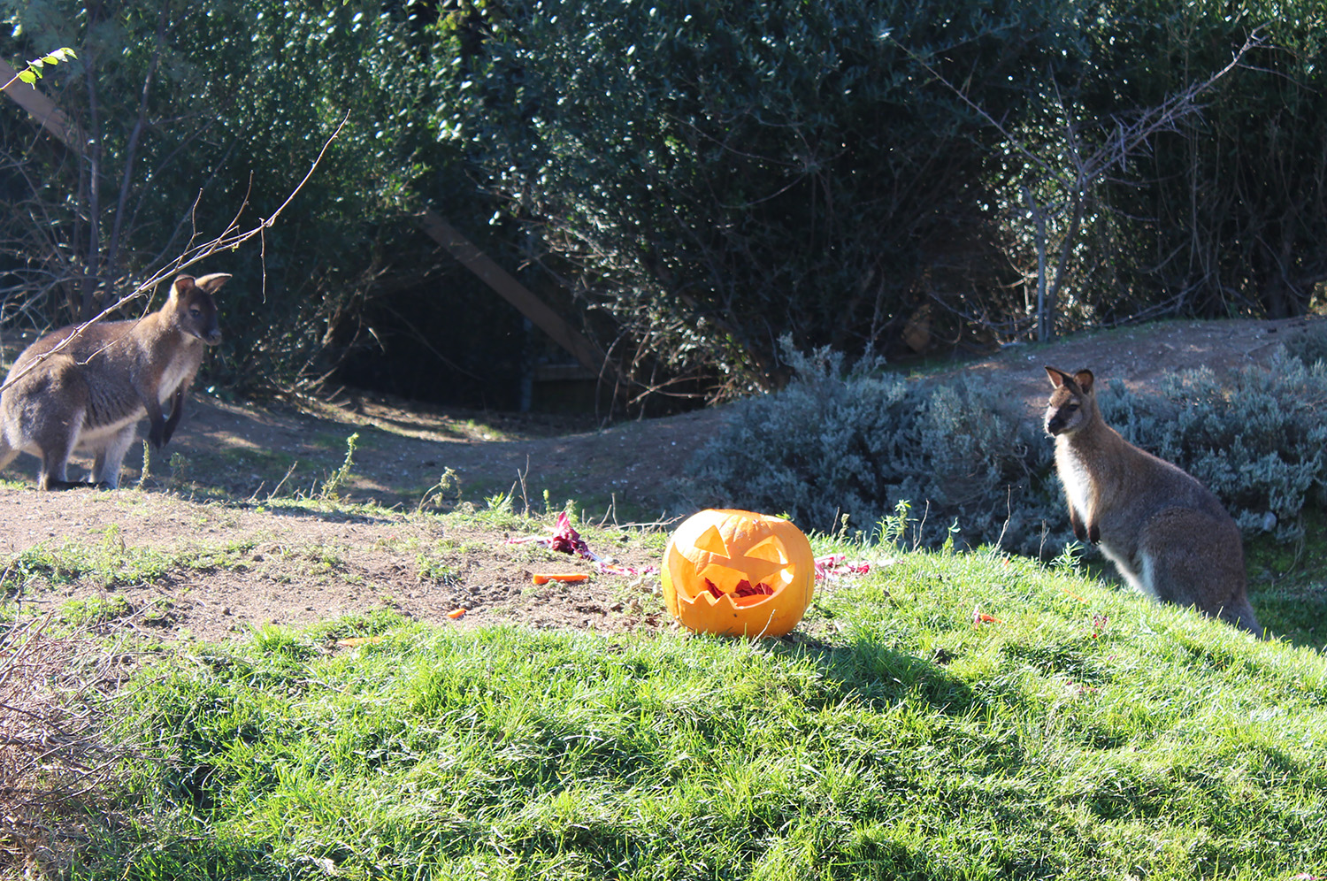 Al posto dei tradizionali dolcetti, i wallaby hanno trovato carote, insalata, radicchio e altre prelibatezze. Conquistati dallo staff, piano piano tutti e cinque i marsupiali dell’Area Australia del parco hanno iniziato a saltare vicino alla zucca, ci hanno prima girato intorno e poi, dopo una decina di minuti, si sono avvicinati a mangiare e a far festa!