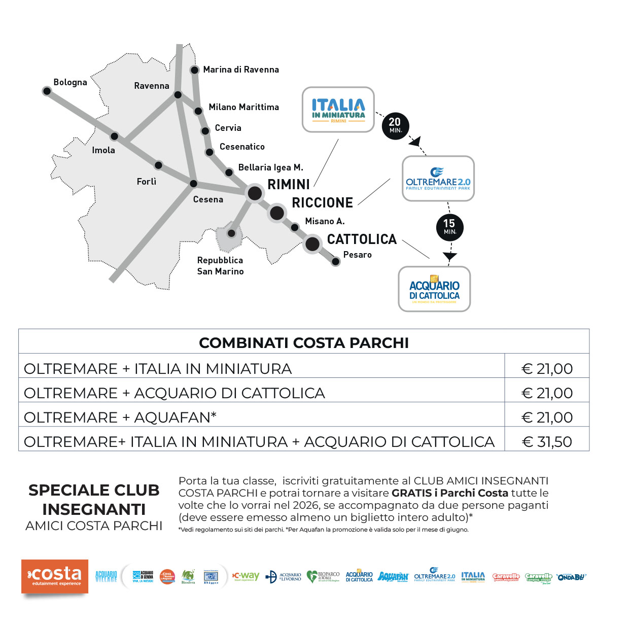 La nascita di Costa Parchi ha un profondo significato didattico. La sinergia fra Oltremare, Acquario di Cattolica e Italia in Miniatura, realtà che esprimono buona parte della proposta educativa e di intrattenimento dell'Emilia Romagna, fa sì che il ventaglio delle opportunità e proposte dedicate alla scuola cresca e si arricchisca di contenuti ed esperienze. Siamo convinti che, solo attraverso la valorizzazione di esperienze diverse, si faccia crescere la cultura di domani.